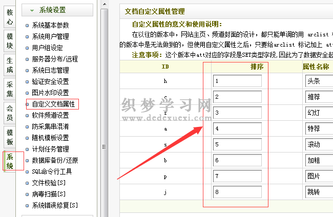 查看文章自定义属性的排序是多少,可在织梦后台依次打开系统-自定义文档属性,如下图: