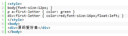中的文字首字母的“源“字要比其它字符大,这里要首先定义div中的一般文字大小,以做区分,一般情况下,一般文字的字号要比下沉的首字母字号要大,这里一般字号的定义在body选择器中,字号为12px。