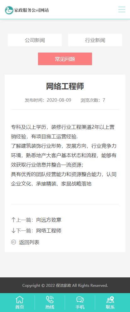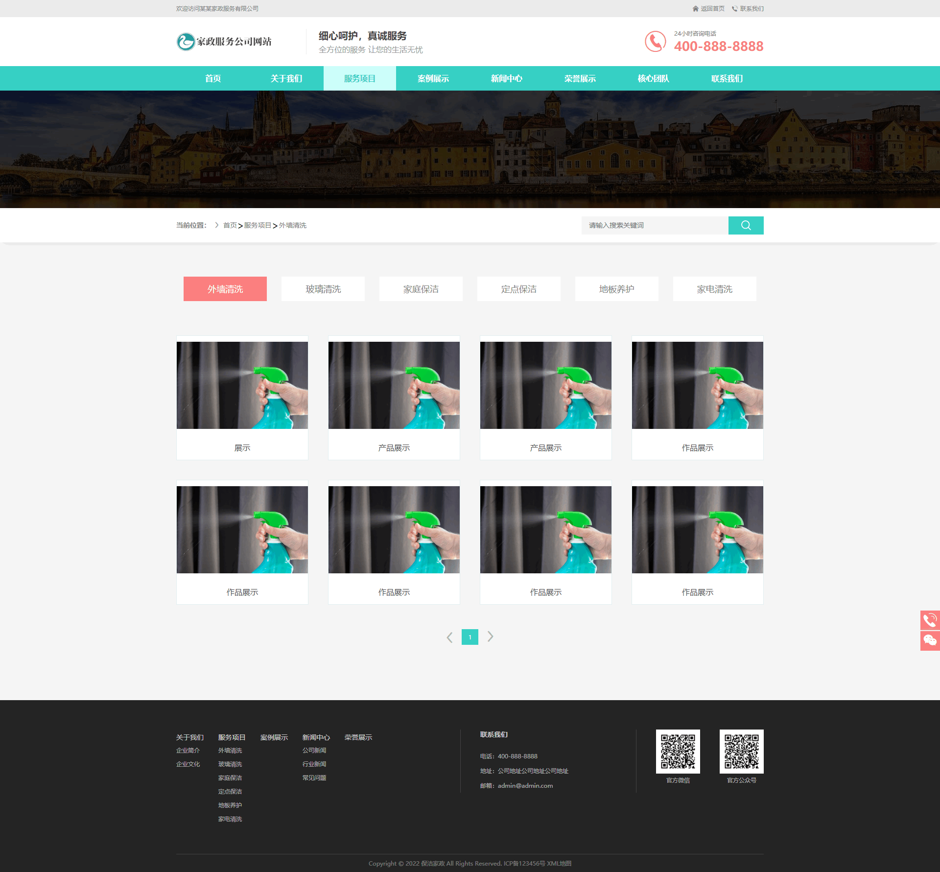 PbootCMS内核开发的网站模板,该模板适用于家政公司网站、家政保洁网站等企业网站,手机自适应,同一个后台,数据即时同步,简单适用!附带测试数据。
