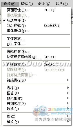 “修改“菜单 使您可以更改选定页面元素或项的属性。使用此菜单,您可以编辑标签属性,更改表格和表格元素,并且为库项和模板执行不同的操作。