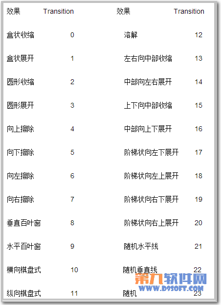 另外还有二十多种效果供你选择,只要将Transition的值改为相应的效果的代号即可,具体效果和设置如下表所示: