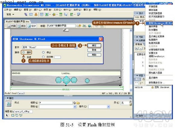 ( 4 )设置 Flash 播放控制。选中“播放“图片,然后同时按下 Shift+F4 键打开行为面板。单击 按钮,在弹出的快捷菜单中选择【控制 Shockwave 或 Flash 】选项,接着在弹出的【控制 Shockwave 或 Flash 】设置窗口中单击选择【播放】选项,具体操作如图 51-5 所示。