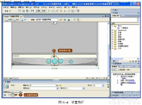 ( 3 )切换到设计视图,选中底部的播放控制图片,然后在属性面板中单击【地图】项里的 按钮,分别对准播放控制图片进行勾绘。为了使勾绘更加精确,单击属性面板中的 按钮,对热区进行调整,结果如图 51-4 所示。