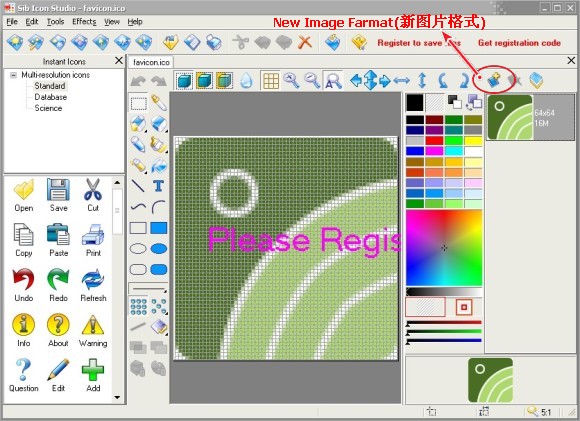 正如我在上面所提到的,如果你设计的是16像素大小的.ico文件,那么你在windows下查看它的时候会发现它是模糊的,为了避免这个问题,我 们需要将设计好的64像素大小的图片再保存为不同的几种格式。起码要有一个48像素大小的.ico格式,这样放入主题文件包中的时候看上去才足够美观。当 然,你只需要在Photoshop中创建一个64像素大小的图标,之后使用Sib Icon Studio软 件完成打包的工作。首先在Sib Icon Studio软件中打开已经做好64像素大小的文件,然后点击New Image Farmat(新图片格式)图标,在弹出的对话框中分别选择48像素和16像素大小,添加到软件界面右侧的侧边栏中,保存文件即可,这样我们就已经将三种 不同大小的图标文件放入了一个.ico格式的文件中,打包完成。如下图: