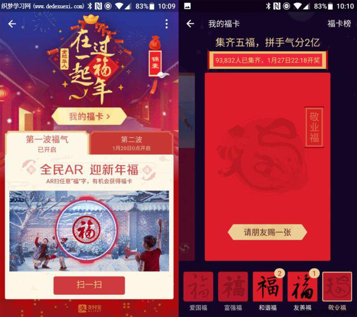 去年春节,支付宝推出AR实景红包,用户需要集齐“富强福、和谐福、友善福、爱国福、敬业福“五福,才有资格瓜分2亿现金红包,其中,敬业福是短版卡,只有少数的人能够集齐。据了解,最终共有79万人集齐支付宝五福平分2.15亿,人均271元。